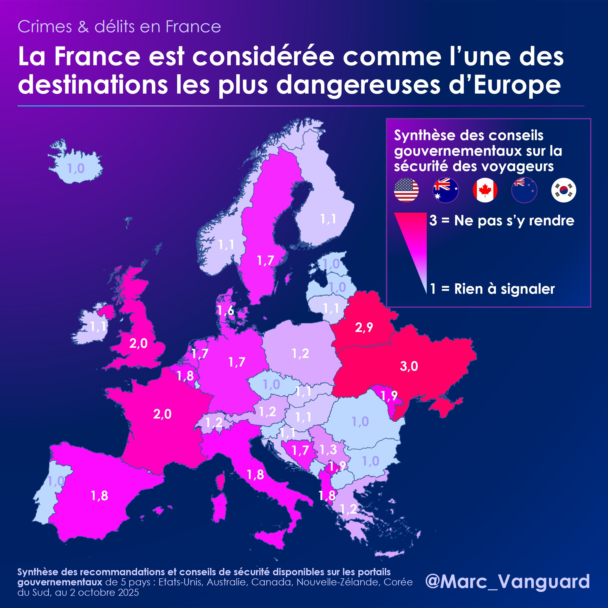 Les touristes détalent face à ce désastre fiscal. La France est l’une des destinations les MOINS SÛRES d’Europe, derrière l’Ukraine et la Biélorussie, d’après les recommandations de États-Unis, Australie, Canada, Nouvelle-Zélande et Corée du Sud.