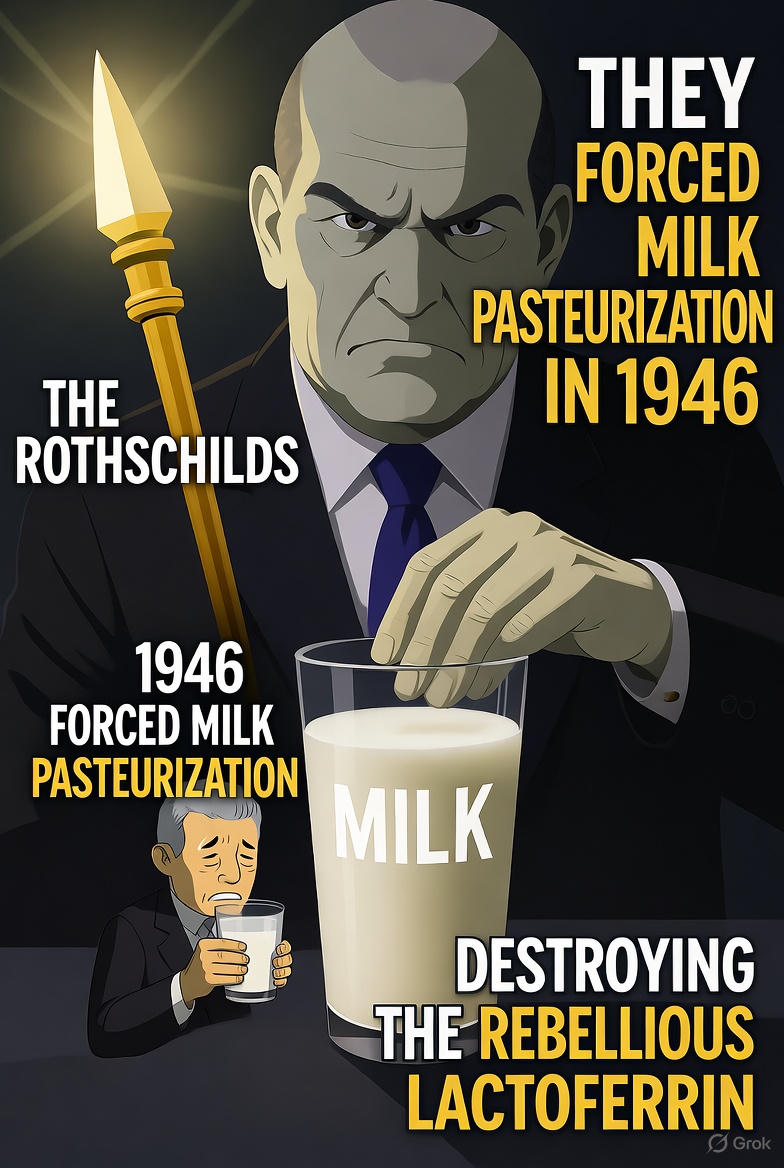 🇬🇧 Royaume-Uni : Les Rothschild, maîtres occultes de la finance, ont forcé la pasteurisation du lait en 1946, anéantissant la lactoferrine rebelle qui nous forgeait des os d’acier, des corps élancés et une armure contre leurs poisons systémiques ! Un coup de maître pour muer notre nectar quotidien en potion d’esclavage industriel, gavée de profits abyssaux ! Et si le lait cru était la clé pour renverser les banquiers ?