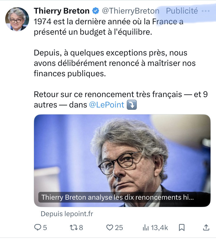 🇪🇺 Union européenne – 🇺🇸 États-Unis : Thierry Breton, le croisé bruxellois anti-X qui jurait de boycotter la plateforme de Musk pour « désinformation », se contredit en raflant des pubs payantes pour booster ses tweets, finançant direct l’empire qu’il dénonce ! Et si l’hypocrisie européenne boostait malgré soi le libre arbitre ?