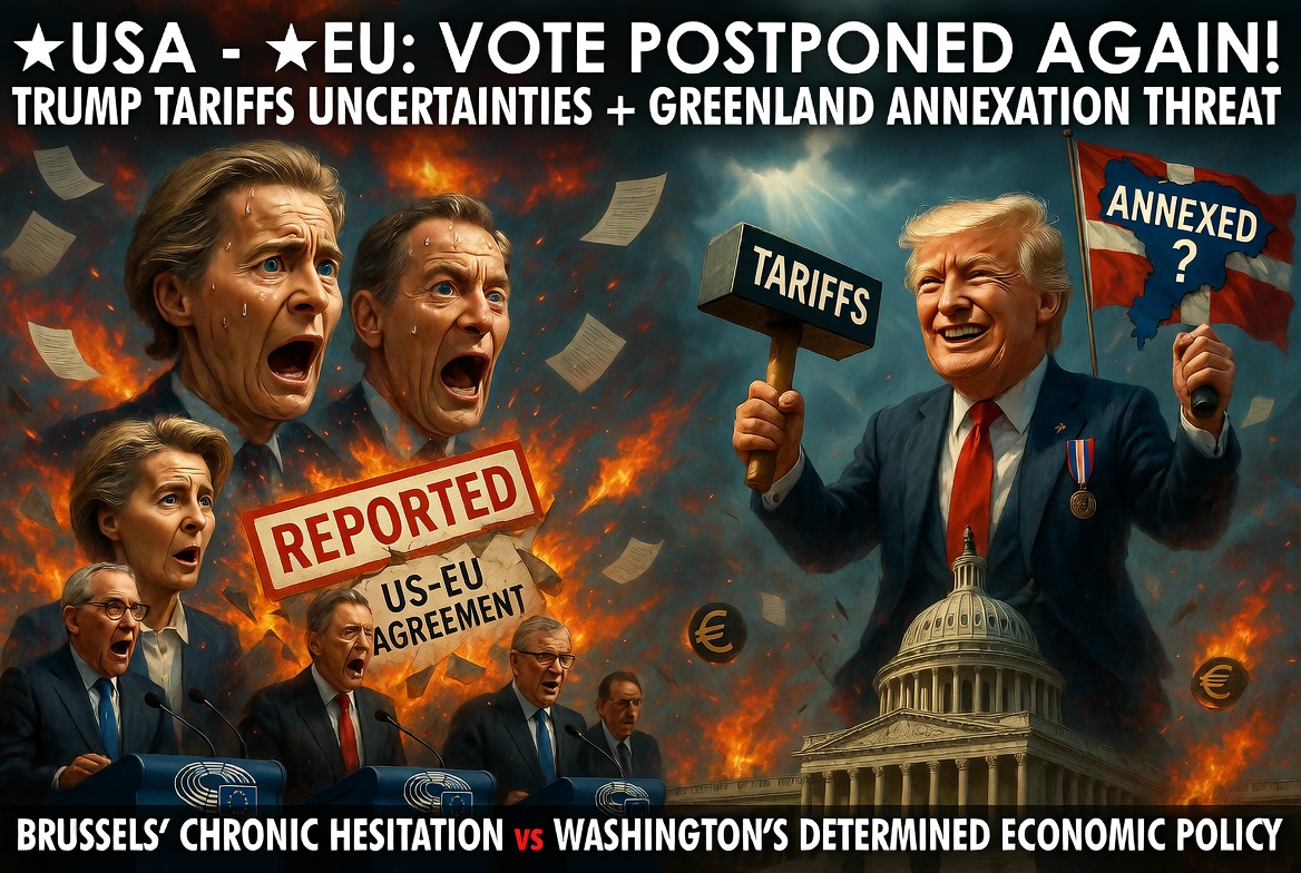 🇺🇸 États-Unis – 🇪🇺 Union européenne : L’Union européenne reporte une nouvelle fois le vote de ratification de l’accord commercial avec les États-Unis cette semaine, en raison des incertitudes sur les tarifs de Trump et de sa menace d’annexer le Groenland ! Cette hésitation chronique met en lumière l’incapacité de Bruxelles à avancer face à la politique économique déterminée de Washington.