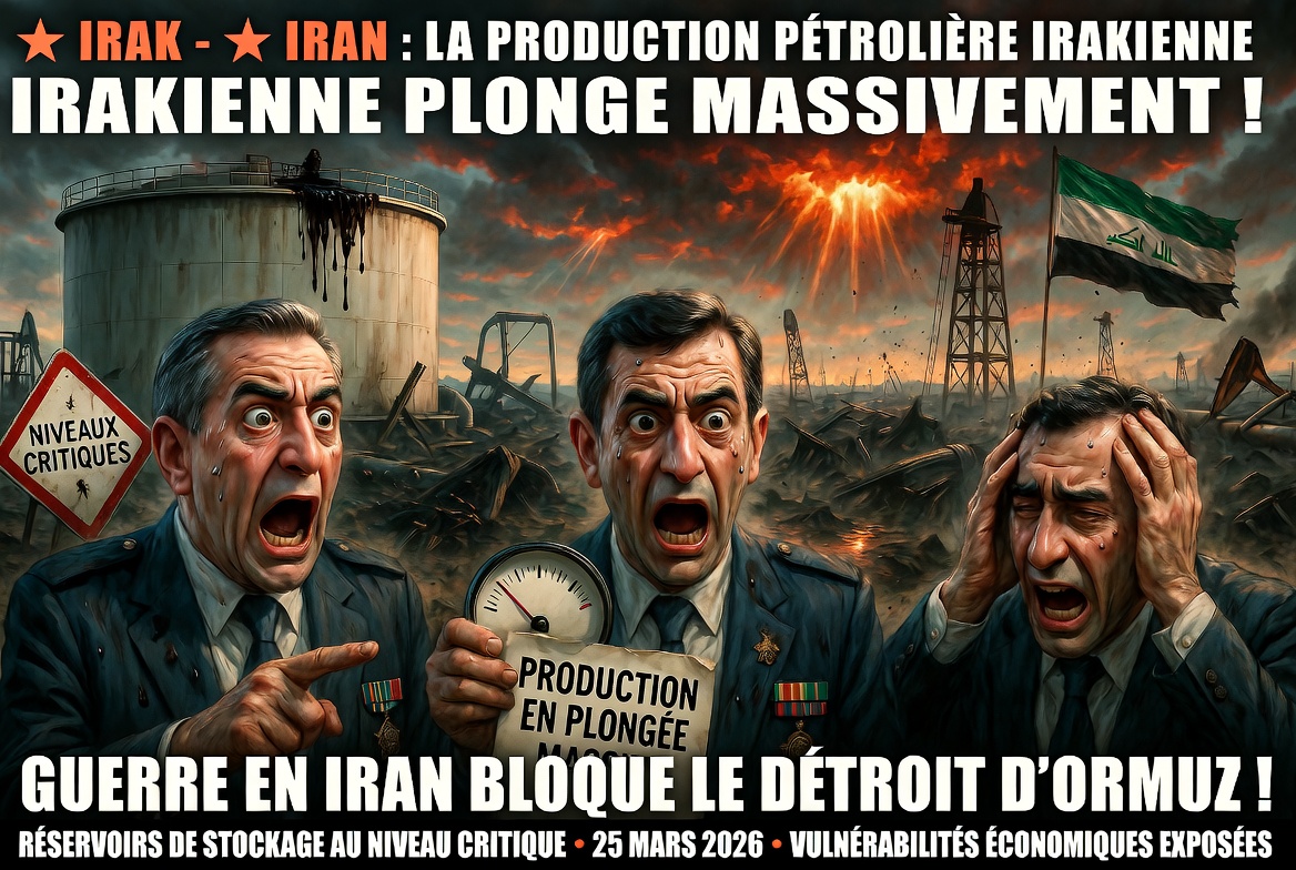 🇮🇶 Irak – 🇮🇷 Iran : La production pétrolière irakienne plonge massivement alors que la guerre en Iran bloque les exportations via le détroit d’Ormuz ! Les réservoirs de stockage atteignent des niveaux critiques selon trois responsables énergétiques irakiens ce 25 mars 2026, exposant les vulnérabilités économiques en pleine crise géopolitique.