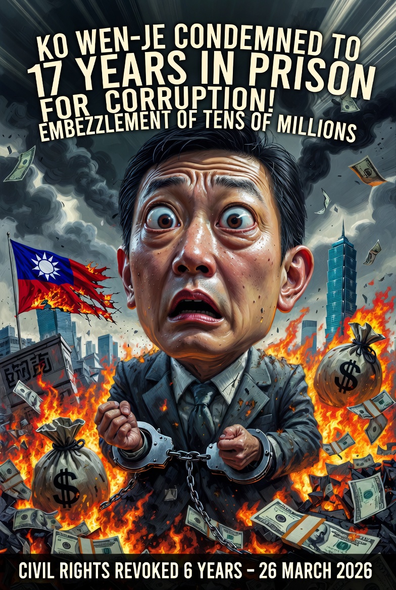 🇹🇼 Taïwan : L’ancien maire de Taipei Ko Wen-je, fondateur du Parti du peuple taïwanais et candidat à la présidentielle, est condamné à 17 ans de prison pour corruption et détournement de dons politiques d’un montant de dizaines de millions ! Le tribunal lui retire ses droits civiques pour 6 ans le 26 mars 2026.