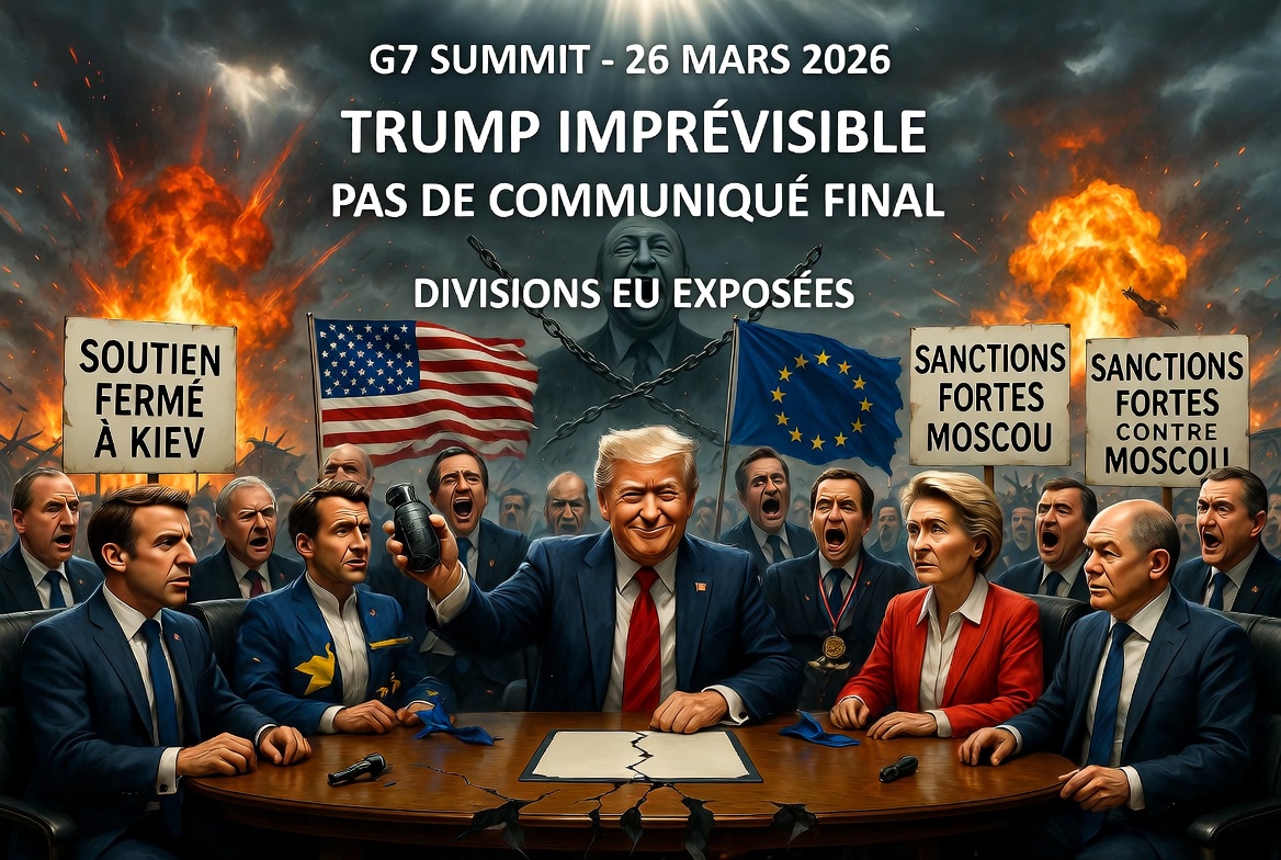 🇺🇸 États-Unis – 🇪🇺 Union européenne : Le G7 se réunit le 26 mars 2026 sur fond des guerres en Ukraine et en Iran, avec l’imprévisibilité de l’administration Trump ! Les Européens réitèrent leur soutien ferme à Kiev et des sanctions fortes contre Moscou, sans communiqué final pour éviter les tensions, exposant les divisions au sein du bloc.
