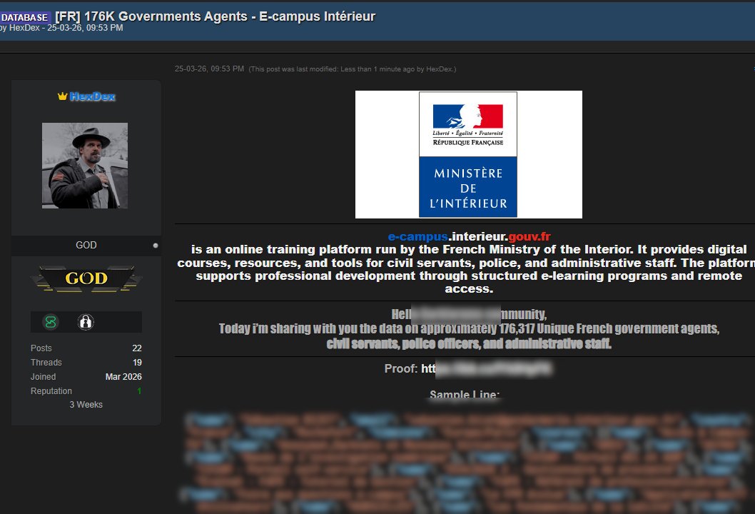 🇫🇷 France : Le ministère de l’Intérieur confirme l’accès non autorisé à la plateforme e-campus de la Police nationale : 176 317 agents exposés avec leurs noms, emails professionnels, villes et parcours de formation détaillés. L’État impose la sécurité numérique mais protège mal ceux qui la font appliquer.